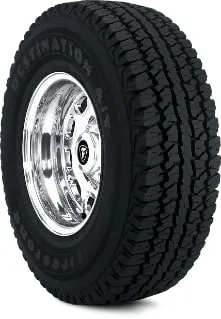 Firestone Destination A/T The Firestone Destination A/T tire is the all-terrain tire built for pickup truck, jeep and SUV drivers who want to go wherever the road leads them. Long-link carbon reinforcement improves treadwear and helps resist cracking, chipping and tearing, while 5-degree noise reduction technology helps minimize noise generation. The Destination A/T tire is built to travel in wet and dry weather as well as light snow conditions, and helps to give you an extra measure of confidence on off-road terrain. |