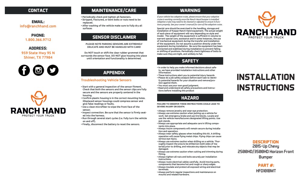 The Horizon Front Bumper is Ranch Hand's smooth metal series. Composed of 7-gauge steel with matte black finish, the Horizon Series remains true to Ranch Hand's reputation for durability and strength. The sleek, contoured design conforms perfectly to a truck's profile replacing the factory bumper with power and style. LED floodlights and spotlights are standard. A optional 2 12-gauge bull nose is optional.