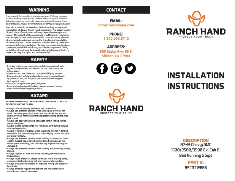 Same Quality And Craftsmanship All The Ranch Hand Products; Offered For Most Vehicles In 4 Step Or 6 Step; Manufactured From 3 in. Top Pipe; 1.5 in. Loop Pipe; 12 Gauge Insert To Match Factory Grille Pattern; Finished With Black Powdercoat Paint Black; Oversized Steps Come In 8 in./14 in. And 18 in. Combinations