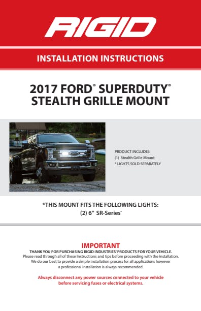 The RIGID 2017-2018 Ford Super Duty Grille Light Mount Kit allows two 6 inch SR-Series LED Lights to be mounted inside a sleek black powder coated steel grille, and gives the Super Duty an aggressive new look while adding the visibility and clarity that comes only with RIGID lights. This light kit comes with the hardware needed to install 2 RIGID SR-Series LED lights. Professional installation recommended. Lights sold separately.