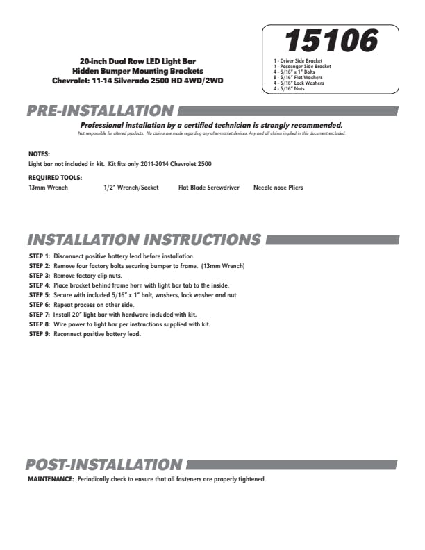 20-inch Dual Row LED Light Bar Hidden Bumper Mounting BracketsChevrolet: 11-14 Silverado 2500 HD 4WD/2WD