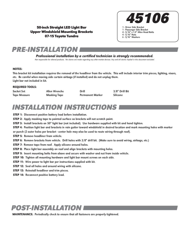 07-15 Toyota Tundra Black Front Roof Mount Straight 50 1/2-inch - 51 3/4-inch Side Mount LED Light Bar Bracket