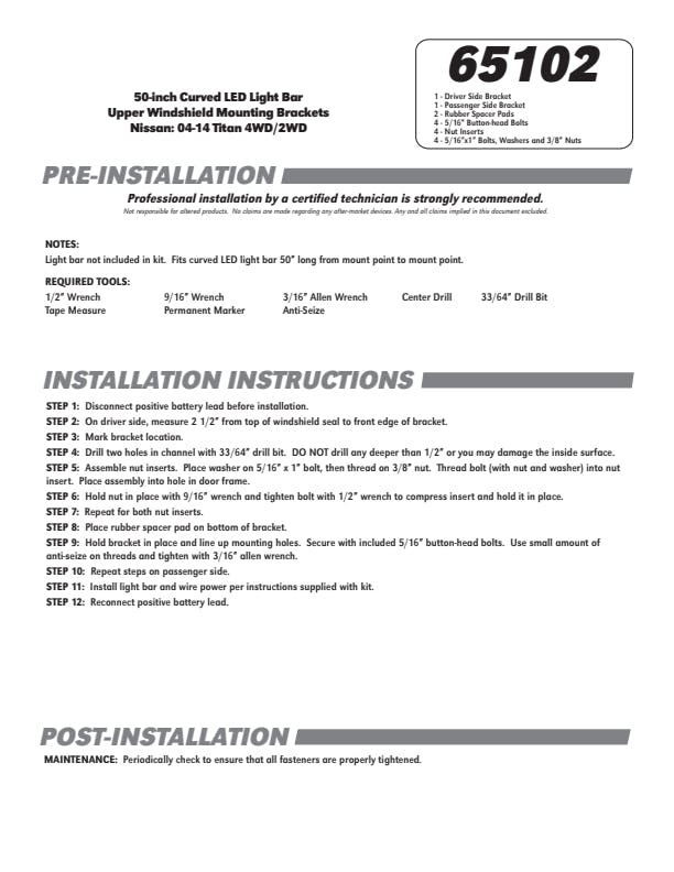 50-inch Curved LED Light Bar Upper Windshield Mounting Brackets (Nissan Titan)Nissan: 04-14 Titan 4WD/2WD