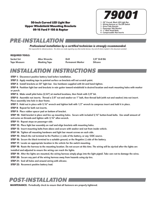 Kit includes Black-out curved light bar, custom vehicle brackets, hardware and wiring harness with switch.;Easy bolt-on installation;24,000 LumensApplication Summary: